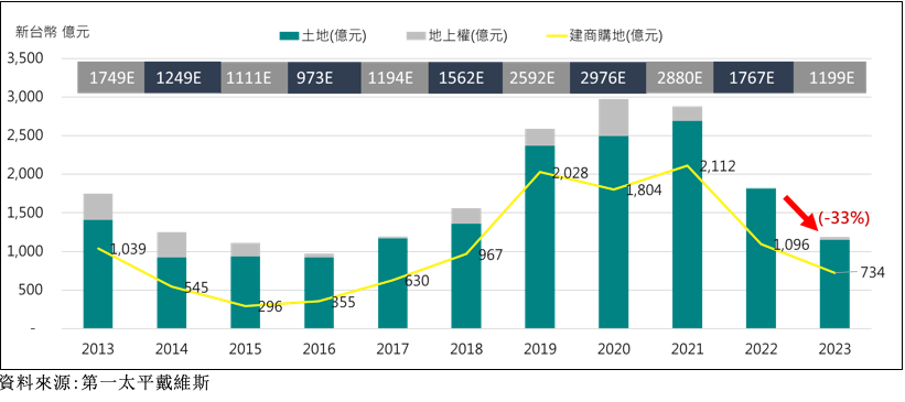 大型土地交易方面,政策搖擺以及央行未放寬土、建融規範的前提下,再加上研議中的囤房稅2.0與虛坪改革方案為建築業帶來更多不確定性,建商購地更為謹慎,2023年土地交易金額為1199億元,建商購地也同步下滑至734億元,年減率33%,購地規模回到2017年置2018年的水準。因應市場的不確定性,建商持續透過參與公辦都更、地上權或者捷運聯開案等方式,降低土地投入資金,以及爭取在土、建融方面更多的彈性。