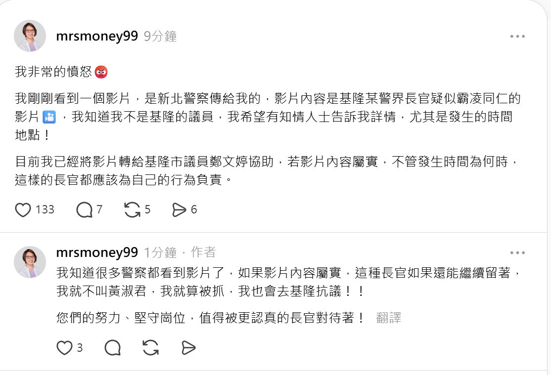 對此,有地方民意代表表達關切。熟悉案情人士指出,已有議員接獲影片與相關陳情,認為若屬實,涉及管理方式是否逾越分際,要求基隆市政府與警察局應儘速調查釐清,針對是否構成職場霸凌、是否違反密錄器使用規範,提出明確說明。